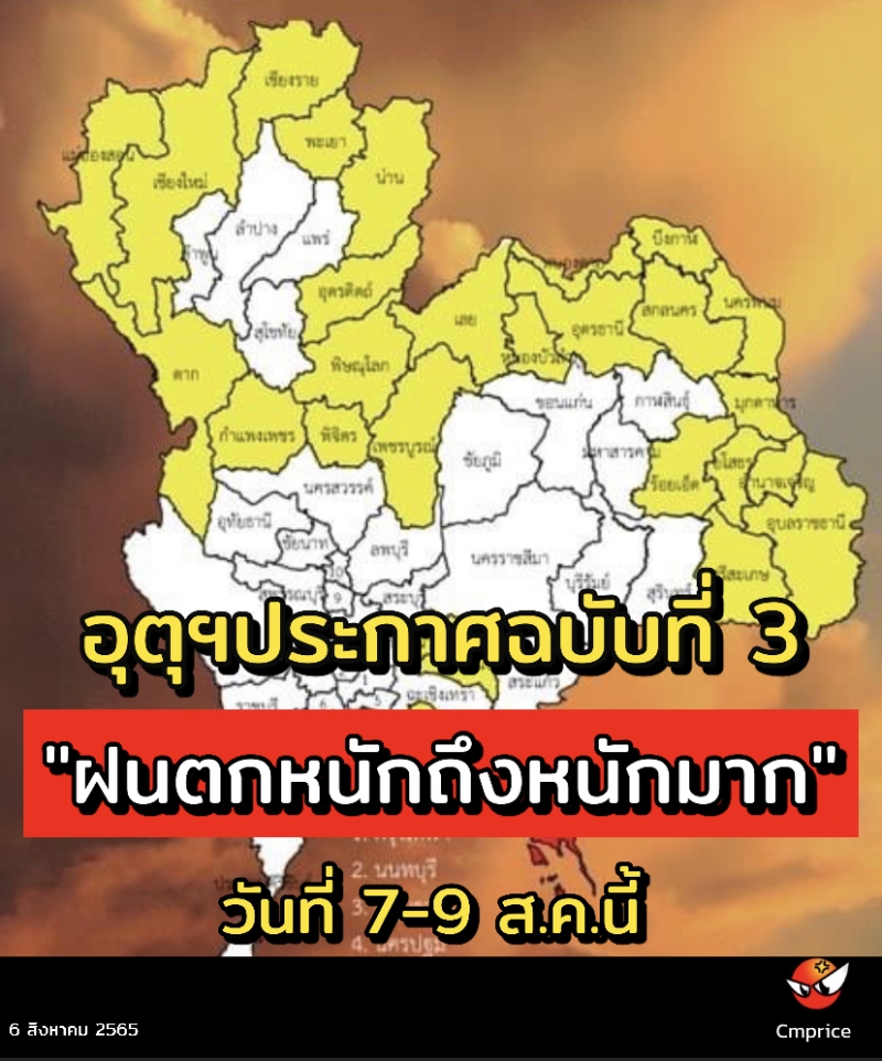 ประกาศกรมอุตุนิยมวิทยา ฉบับที่ 3 ลงวันที่ 06 สิงหาคม 2565 เรื่อง "ฝนตกหนักถึงหนักมากบริเวณประเทศไทย และคลื่นลมแรงบริเวณทะเลอันดามัน (มีผลกระทบตั้งแต่วันที่ 7-9 สิงหาคม 2565)
