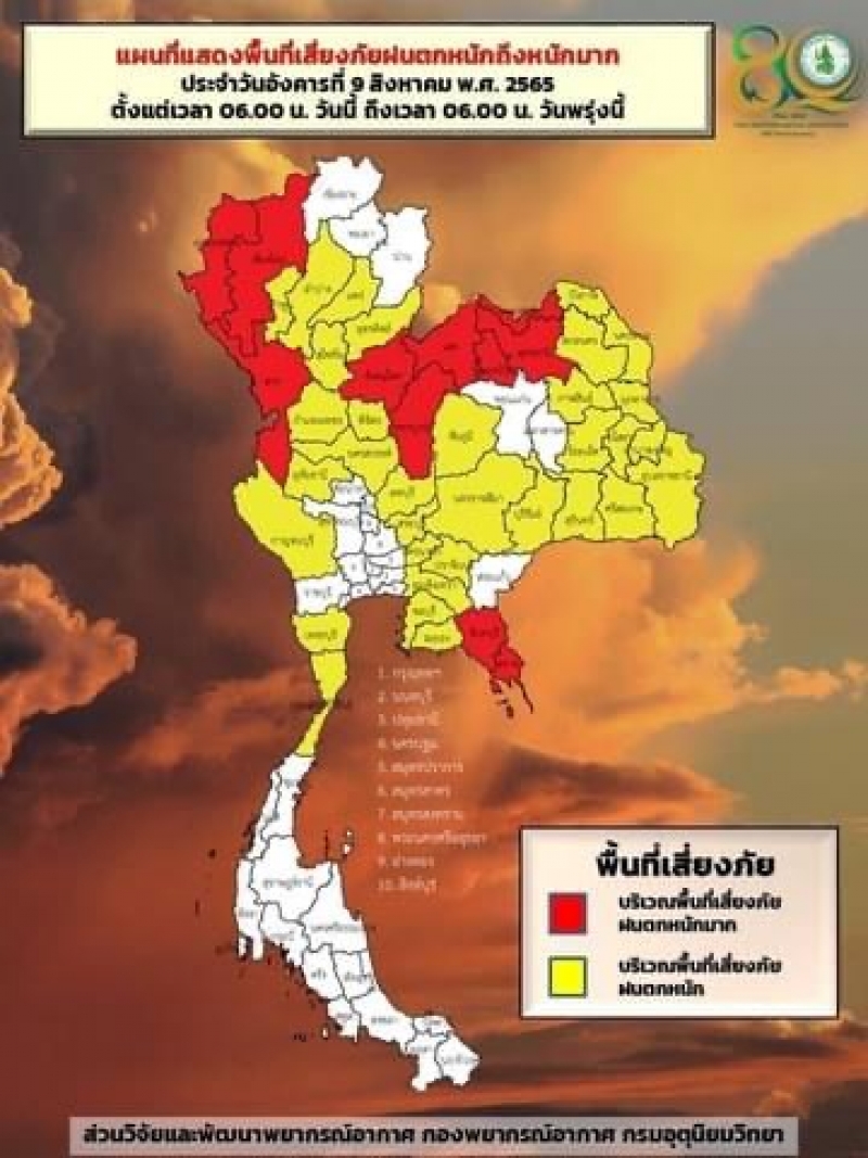 พยากรณ์อากาศ 24 ชั่วโมงข้างหน้า (9 ส.ค. 65) : ประเทศไทยมีฝนตกหนักหลายพื้นที่และมีฝนตกหนักมากบางแห่งบริเวณภาคเหนือ ภาคตะวันออกเฉียงเหนือ ภาคกลาง ภาคตะวันออก และภาคใต้ฝั่งตะวันออก ขอให้ประชาชนในบริเวณดังกล่าวระวังอันตรายจากฝนตกหนักถึงหนักมากและฝนที่ตกสะสม ซึ่งอาจทำให้เกิดน้ำท่วมฉับพลันและน้ำป่าไหลหลาก โดยเฉพาะพื้นที่ลาดเชิงเขาใกล้ทางน้ำไหลผ่านและพื้นที่ลุ่มในระยะนี้ไว้ด้วย ส่วนคลื่นลมบริเวณทะเลอันดามันตอนบนมีกำลังค่อนข้างแรง โดยมีคลื่นสูง 2-3 เมตร บริเวณที่มีฝนฟ้าคะนองคลื่นสูงมากกว่า 3 เมตร และอ่าวไทยตอนบนมีคลื่นสูงประมาณ 2 เมตร บริเวณที่มีฝนฟ้าคะนองคลื่นสูงมากกว่า 2 เมตร ขอให้ชาวเรือในบริเวณดังกล่าวเดินเรือด้วยความระมัดระวังและหลีกเลี่ยงการเดินเรือบริเวณที่มีฝนฟ้าคะนอง สำหรับเรือเล็กบริเวณทะเลอันดามันตอนบนควรงดออกจากฝั่งต่อไปอีก 1 วัน