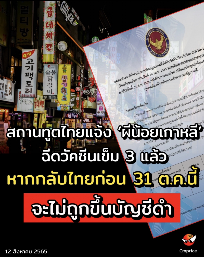 | • สถานทูตไทยแจ้ง! ผีน้อยเกาหลี ฉีดวัคซีนเข็ม 3 แล้ว หากกลับไทยก่อน 31 ต.ค.นี้ จะไม่ถูกขึ้นบัญชีดำ |
