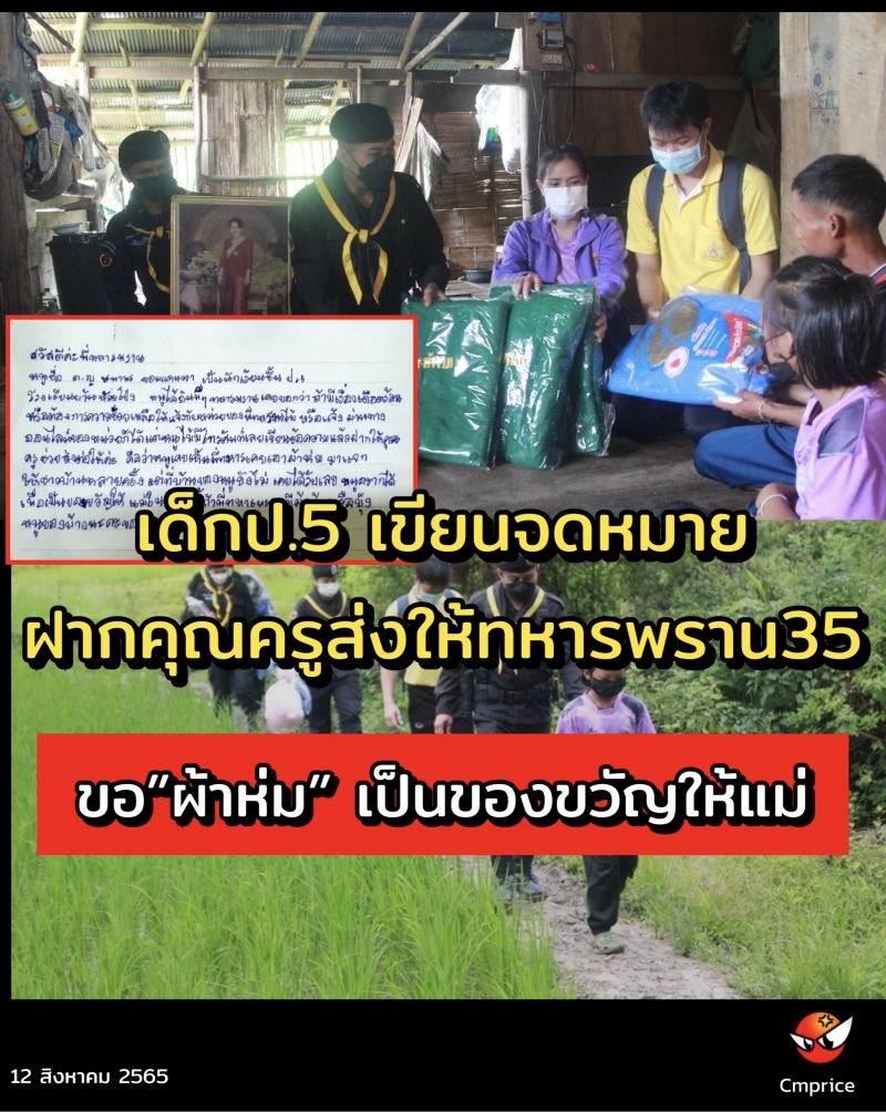 เมื่อวันที่ 7 ส.ค.65 หน่วยเฉพาะกิจกรมทหารพรานที่35 ได้รับแจ้งจากครูโรงเรียนบ้านห้วยโป่ง ผ่าน line official ของหน่วย โดยมีข้อความดังนี้ “หนูชื่อ ด.ญ.ชนาพร จอมแดนนา เป็นนักเรียนชั้น ป.5 โรงเรียนบ้านห้วยโป่ง เคยได้ยินพี่ๆทหารพรานเคยบอกว่าถ้ามีเรื่องเดือดร้อนหรือต้องการความช่วยเหลือให้แจ้งกับหน่วยของพี่ทหาร ผ่านทางออนไลน์ของหน่วยก็ได้ แต่หนูไม่มีโทรศัพท์เลยเขียนข้อความแล้วฝากให้คุณครูช่วยส่งต่อให้ค่ะ คือว่าหนูเคยเห็นพี่ทหารเคยเอาผ้าห่ม มาแจกให้ชาวบ้านหลายครั้ง แต่ที่บ้านของหนูยังไม่เคยได้รับเลย หนูอยากได้เพื่อเป็นของขวัญให้ แม่ในวันแม่นี้ถ้าพี่ทหารพรานมีผ้าห่มหรือมุ้งหนูขอบ้างนะคะขอบคุณคะ”