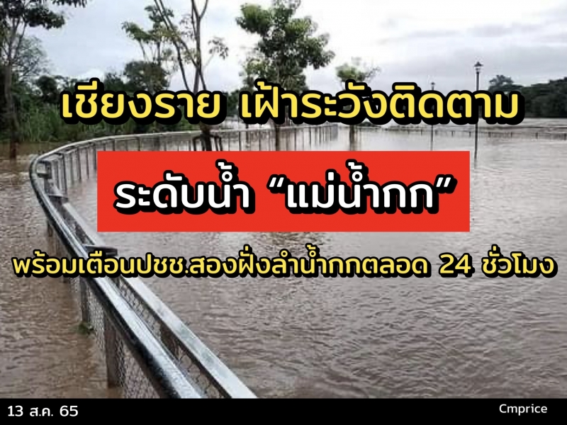 เช้าวันนี้ (13 ส.ค.65) เวลา 08.00 น. ที่บริเวณลานกีฬาริมน้ำกก มวลน้ำจากแม่น้ำกกไหลล้นตลิ่งเข้าท่วม บริเวณลานกีฬาริมน้ำกก หลังวัดฝั่งหมิ่น ตำบลริมกก อำเภอเมืองเชียงราย และบ้านเรือนประชาชนในชุมชนริมน้ำกก โดยเจ้าหน้าที่ป้องกันและบรรเทาสาธารณภัยจังหวัดเชียงราย เทศบาลนครเชียงราย ได้ช่วยเหลือชาวบ้านชุมชนป่าแดงชุมชนร่องเสือเต้น ยกสิ่งของขึ้นที่สูงขึ้น และขอให้ชุมชนติดลำน้ำกกเฝ้าระวังปริมาณติดตามสถานการณ์น้ำอย่างใกล้ชิด