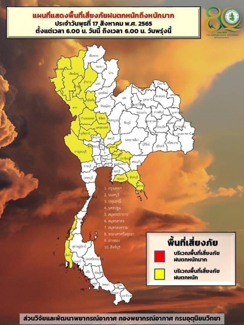 พยากรณ์อากาศประจำวันที่ 17 สิงหาคม 2565 พยากรณ์อากาศ 24 ชั่วโมงข้างหน้า มรสุมตะวันตกเฉียงใต้ที่พัดปกคลุมทะเลอันดามัน ประเทศไทย และอ่าวไทยมีกำลังแรงขึ้น ประกอบกับมีหย่อมความกดอากาศต่ำปกคลุมบริเวณประเทศเมียนมา ลักษณะเช่นนี้ทำให้ยังคงมีฝนตกหนักบางแห่งในภาคเหนือด้านตะวันตก ภาคกลาง ภาคตะวันออกและภาคใต้ฝั่งตะวันตก ขอให้ประชาชนในบริเวณดังกล่าวระวังอันตรายจากฝนตกหนักและฝนที่ตกสะสมซึ่งอาจทำให้เกิดน้ำท่วมฉับพลันและน้ำป่าไหลหลาก โดยเฉพาะพื้นที่ลาดเชิงเขาใกล้ทางน้ำไหลผ่านและพื้นที่ลุ่มไว้ด้วย ส่วนคลื่นลมบริเวณทะเลอันดามันตอนบนมีกำลังแรงขึ้น โดยมีคลื่นสูง 1-2 เมตร บริเวณที่มีฝนฟ้าคะนองคลื่นสูงมากกว่า 2 เมตร