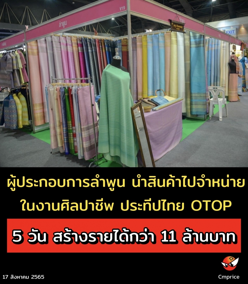 โดยจังหวัดลำพูน มีผู้ผลิต ผู้ประกอบการ OTOP และผู้ประกอบการ SE รวม 54 ราย เปิดบูทจำหน่ายสินค้า ทั้งสิ้น43 บูธ สร้างยอดจำหน่ายสะสม 5 วัน (12 -16 สิงหาคม 2565) รวม 11,055,747 บาท