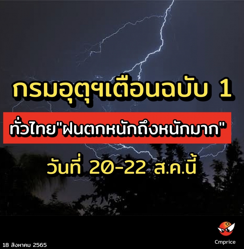 ประกาศกรมอุตุนิยมวิทยา "ฝนตกหนักถึงหนักมากบริเวณประเทศไทย (มีผลกระทบตั้งแต่วันที่ 20-22 สิงหาคม2565)" ฉบับที่ 1 ลงวันที่ 18 สิงหาคม 2565