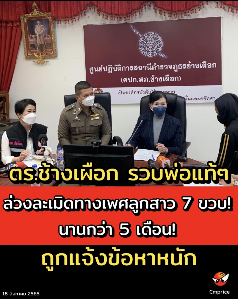 วันนี้ 18 ส.ค. 65 เวลา 11.30 น. พ.ต.อ.กิตติพงษ์ เพ็ชรมุณี ผกก.สภ.ช้างเผือก พร้อมด้วย นางปวีณา หงสกุลประธานมูลนิธิปวีณา นางจิราพร เชาว์ประยูร ยามาโมโต้ พัฒนาสังคมและความมั่นคงของมนุษย์จังหวัดเชียงใหม่และนางรชยา ฮั่นตระกูล หัวหน้าบ้านพักเด็กและครอบครัวจังหวัดเชียงใหม่ ร่วมแถลงข่าวกรณีพ่อแท้ๆ ล่วงละเมิดทางเพศลูกสาว เป็นเวลากว่า 5 เดือน
