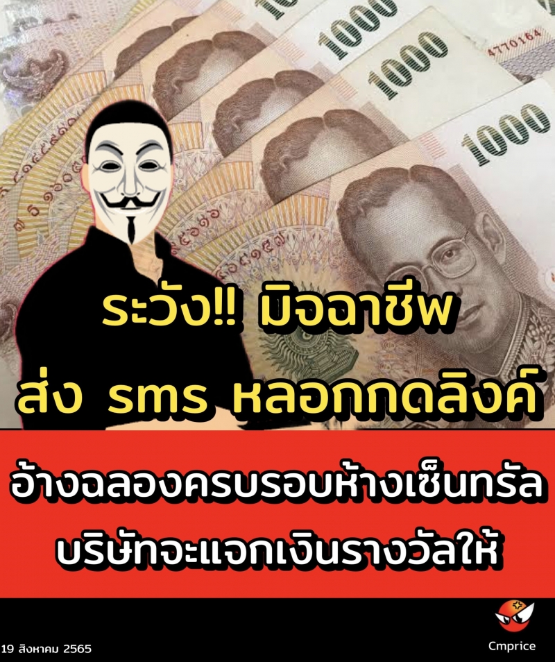ปัจจุบันกลุ่มมิจฉาชีพได้เปลี่ยนการหลอกลวงผ่าน SMS จากเดิมรูปแบบเดิมมาเป็นการส่งข้อความเชิญชวน ด้วยข้อความการจูงใจต่าง ๆ ล่าสุดจากรายงานของสำนักงานตำรวจแห่งชาติ มิจฉาชีพส่งข้อความฉลองครบรอบห้างสรรพสินค้าเซ็นทรัล อ้างว่าทางบริษัทจะแจกเงินรางวัลให้ โดยให้แอดไลน์ผ่านลิงก์ที่แนบมากับข้อความ ซึ่งสำนักงานตำรวจแห่งชาติ ได้สอบถามไปยัง บริษัท สรรพสินค้าเซ็นทรัล จำกัด หรือ ห้างสรรพสินค้าเซ็นทรัล แล้ว ได้รับการยืนยันว่าบริษัทฯไม่ได้มีการจัดกิจกรรมแจกเงินรางวัลในลักษณะดังกล่าวแต่อย่างใด