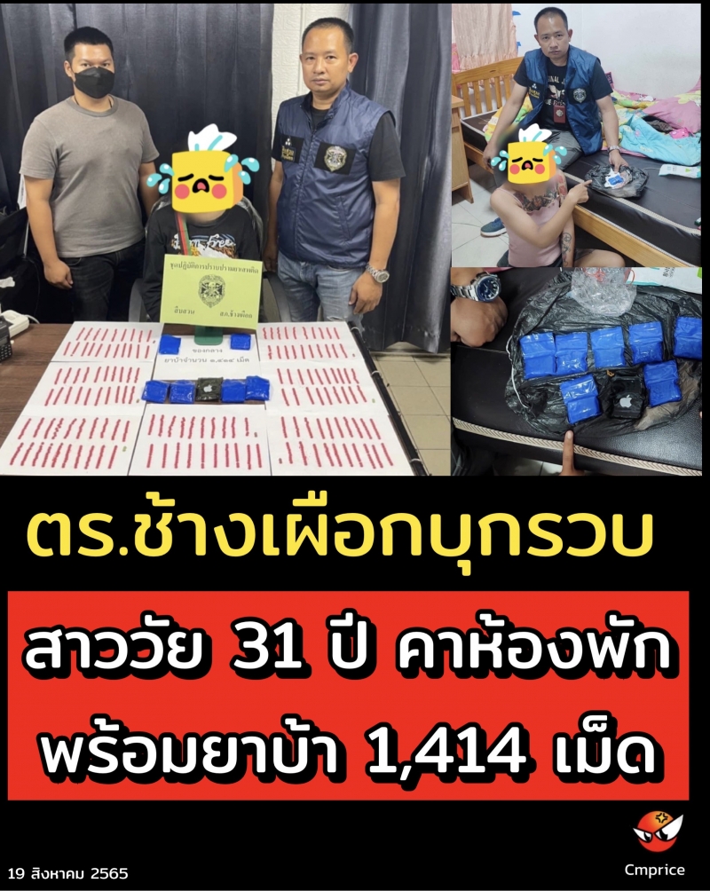 | • ชุดปราบปรามยาเสพติด สภ.ช้างเผือก บุกรวบสาววัย 31 ปี คาห้องพัก พร้อมยาบ้า 1,414 เม็ด |
