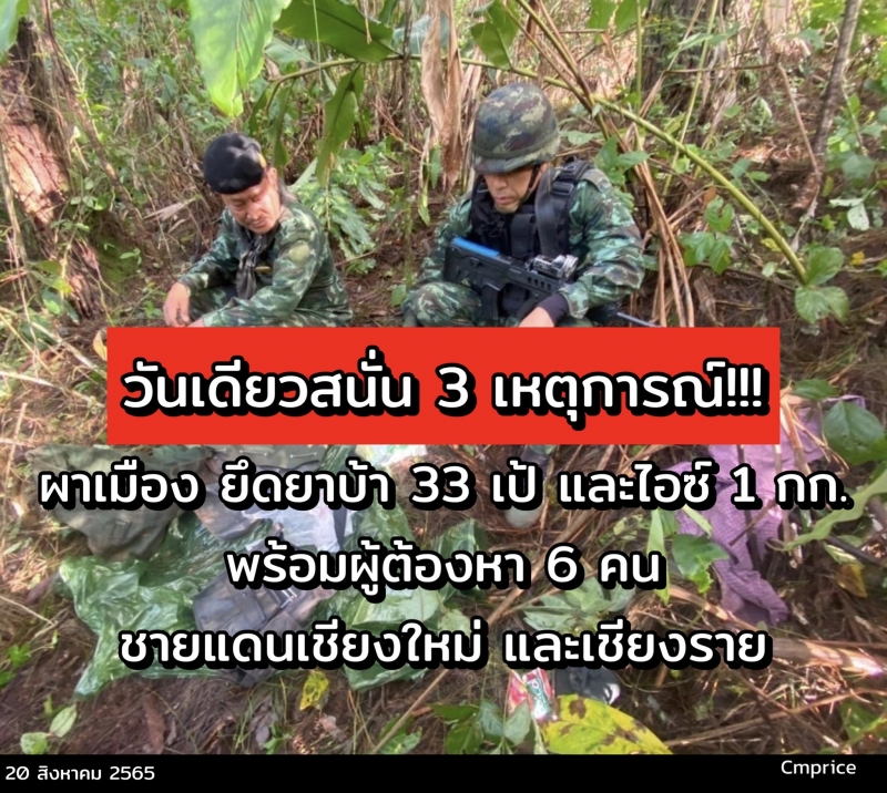 ห้วงวันที่ 19 ส.ค. 65 เวลา 02:30 น. กองบังคับการควบคุมทหารพรานศูนย์ปฏิบัติการกองทัพภาคที่ 3 ร่วมกับกองร้อยเคลื่อนที่เร็วกองกำลังผาเมือง ตั้งจุดตรวจ/จุดสกัดกั้น บริเวณบ้านปางต้นกอก ต.มะลิกา อ.แม่อาย จ.เชียงใหม่ระหว่างปฏิบัติหน้าที่ได้มีรถยนต์ต้องสงสัยขับหลบหนีจุดตรวจ/จุดสกั้น เจ้าหน้าที่จึงได้ทำการไล่ติดตามจับกุม จนสามารถจับกุมได้ที่บริเวณจุดตรวจ/จุดสกัดกั้น กิ่วสะไต ต.ป่าตึง อ.แม่จัน จ.เชียงราย จากการตรวจสอบ พบผู้ต้องสงสัย จำนวน 2 คน แต่ไม่พบสิ่งผิดกฎหมายภายในรถ หน่วยจึงได้ตรวจสอบพื้นที่ระหว่างทาง ที่รถคันดังกล่าวขับหลบหนีมา พบเป้กระสอบ จำนวน 13 เป้ ภายในบรรจุยาบ้า ต่อมาหน่วยเฉพาะกิจกรมทหารม้าที่ 3 กองกำลังผาเมืองขยายผลทำการจับกุมกลุ่มขบวนการเพิ่มเติม โดยสามารถจับกุมผู้ต้องหาเพิ่ม จำนวน 2 คน และรถยนต์ จำนวน 2 คันบริเวณตลาดบ้านสันกอง ต.แม่ไร่ อ.แม่จันฯ และ บริเวณรีสอร์ท บ.สันนา ต.แม่คำ อ.แม่จันฯ
