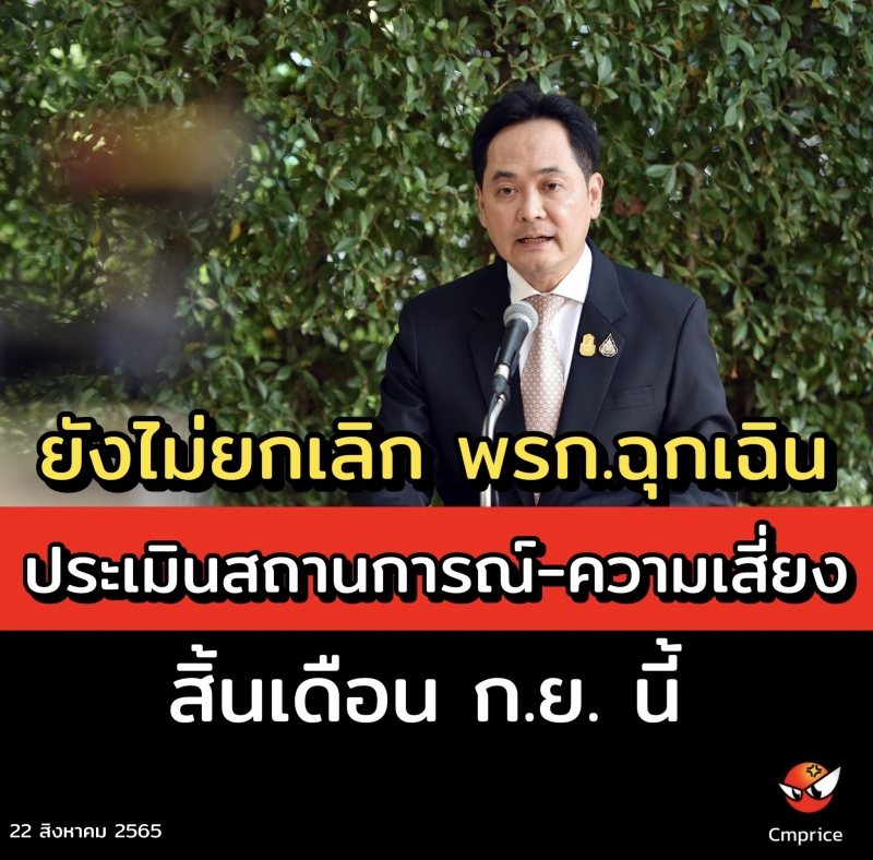 | • ยังไม่ยกเลิก พรก.ฉุกเฉิน ประเมินสถานการณ์-ความเสี่ยง สิ้นก.ย.เดือนนี้ |