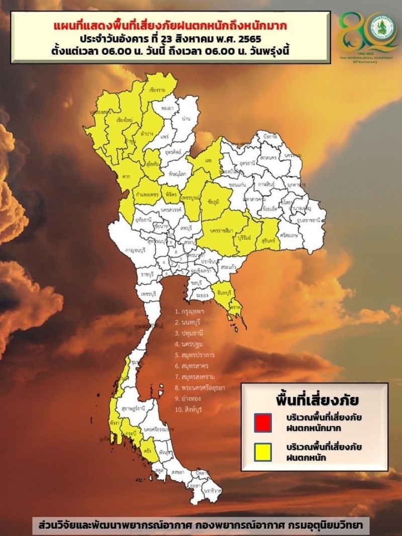 กรมอุตุนิยมวิทยา พยากรณ์อากาศ สภาพอากาศวันนี้(23 ส.ค.65) ร่องมรสุมพาดผ่านประเทศเมียนมา ประเทศลาวตอนบน เข้าสู่หย่อมความกดอากาศต่ำบริเวณประเทศเวียดนามตอนบน ประกอบกับมรสุมตะวันตกเฉียงใต้กำลังปานกลางพัดปกคลุมทะเลอันดามัน ประเทศไทย และอ่าวไทย ลักษณะเช่นนี้ทำให้ประเทศไทยมีฝนตกหนักบางแห่งในภาคเหนือ ภาคตะวันออก และภาคใต้ฝั่งตะวันตก