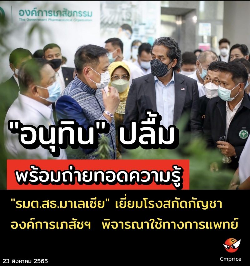 23 สิงหาคม 2565 ที่องค์การเภสัชกรรม อ.ธัญบุรี จ.ปทุมธานี ผู้สื่อข่าวรายงานว่า นายอนุทิน ชาญวีรกูล รองนายกรัฐมนตรีและรัฐมนตรีว่าการกระทรวงสาธารณสุข พร้อมด้วยคณะผู้บริหาร ได้นำนาย Khairy Jamaluddin ABU BAKAR รัฐมนตรีว่าการกระทรวงสาธารณสาธารณสุข ประเทศมาเลเซีย เยี่ยมชมโรงงานผลิตยาและสารสกัดกัญชาขององค์การเภสัชกรรม