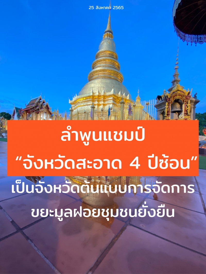 “ลำพูน” คว้าแชมป์จังหวัดสะอาด ระดับประเทศ ปี 2565 ต่อเนื่องเป็นระยะเวลา 4 ปี ติดต่อกัน ยกเป็นจังหวัดต้นแบบการจัดการขยะมูลฝอยชุมชนยั่งยืน รักษามาตรฐานได้ดีเยี่ยม
