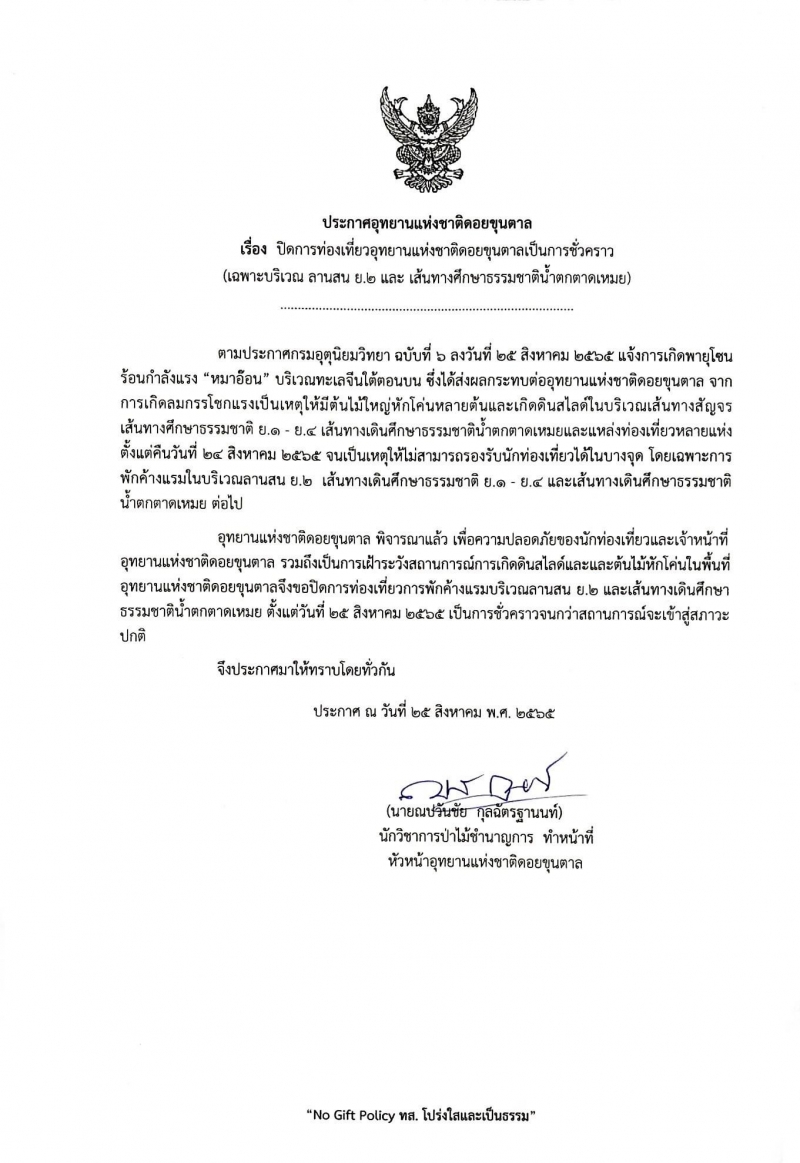 อุทยานแห่งชาติดอยขุนตาล ประกาศปิดการท่องเที่ยวชั่วคราว เฉพาะบริเวณ ลานสน ย.2 และเส้นทางเดินศึกษาธรรมชาติน้ำตกตาดเหมย หลังได้รับผลกระทบจากพายุ “หมาอ๊อน” ทำต้นไม้ใหญ่หักโค่นดินสไลด์ปิดเส้นทางศึกษาธรรมชาติ