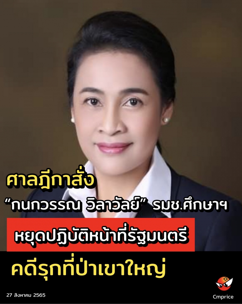 | • ศาลฎีกาสั่ง กนกวรรณ วิลาวัลย์ รมช.ศึกษาฯ หยุดปฏิบัติหน้าที่รัฐมนตรี หลังรับพิจารณาคำร้อง ป.ป.ช. วินิจฉัยฝ่าฝืนจริยธรรมฯ คดีรุกที่ป่าเขาใหญ่ |