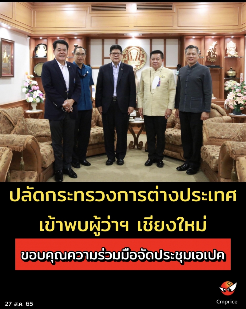 ปลัดกระทรวงการต่างประเทศ เข้าพบผู้ว่าราชการจังหวัดเชียงใหม่ แสดงความขอบคุณต่อความร่วมมือในการจัดการประชุมเจ้าหน้าที่อาวุโสเอเปค ครั้งที่ 3 ระหว่างวันที่ 16-31 สิงหาคม 2565