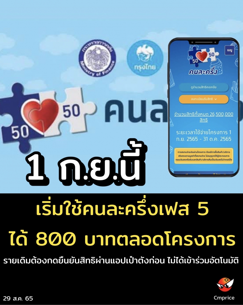 | • 1 ก.ย.นี้ เริ่มใช้คนละครึ่งเฟส 5 วงเงิน 800 บาทตลอดโครงการ รายเดิมต้องกดยืนยัน |