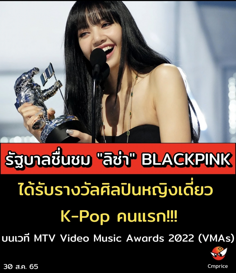 | • รัฐบาลชื่นชม "ลิซ่า" BLACKPINK ได้รับรางวัลศิลปินหญิงเดี่ยว K-Pop คนแรก บนเวที MTV Video Music Awards 2022 (VMAs) |