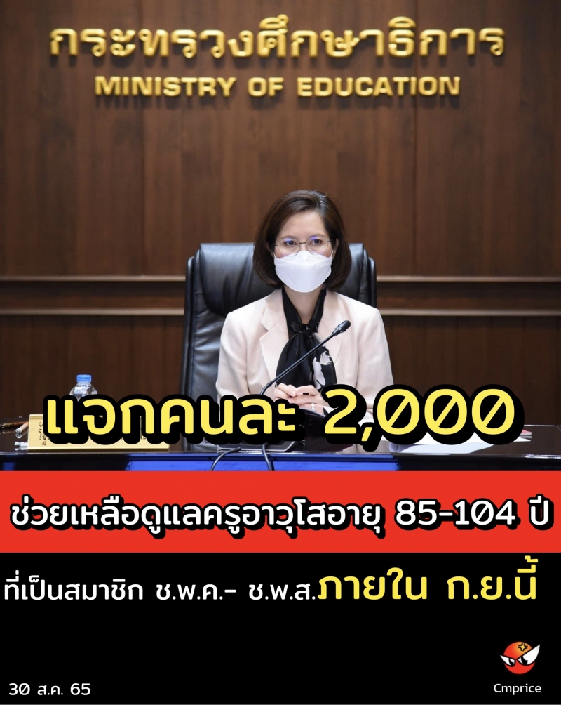 แจกคนละ 2,000 ช่วยเหลือดูแลครูอาวุโสที่เป็นสมาชิก ช.พ.ค.- ช.พ.ส. อายุ 85-104 ปี ภายในเดือนกันยายนนี้