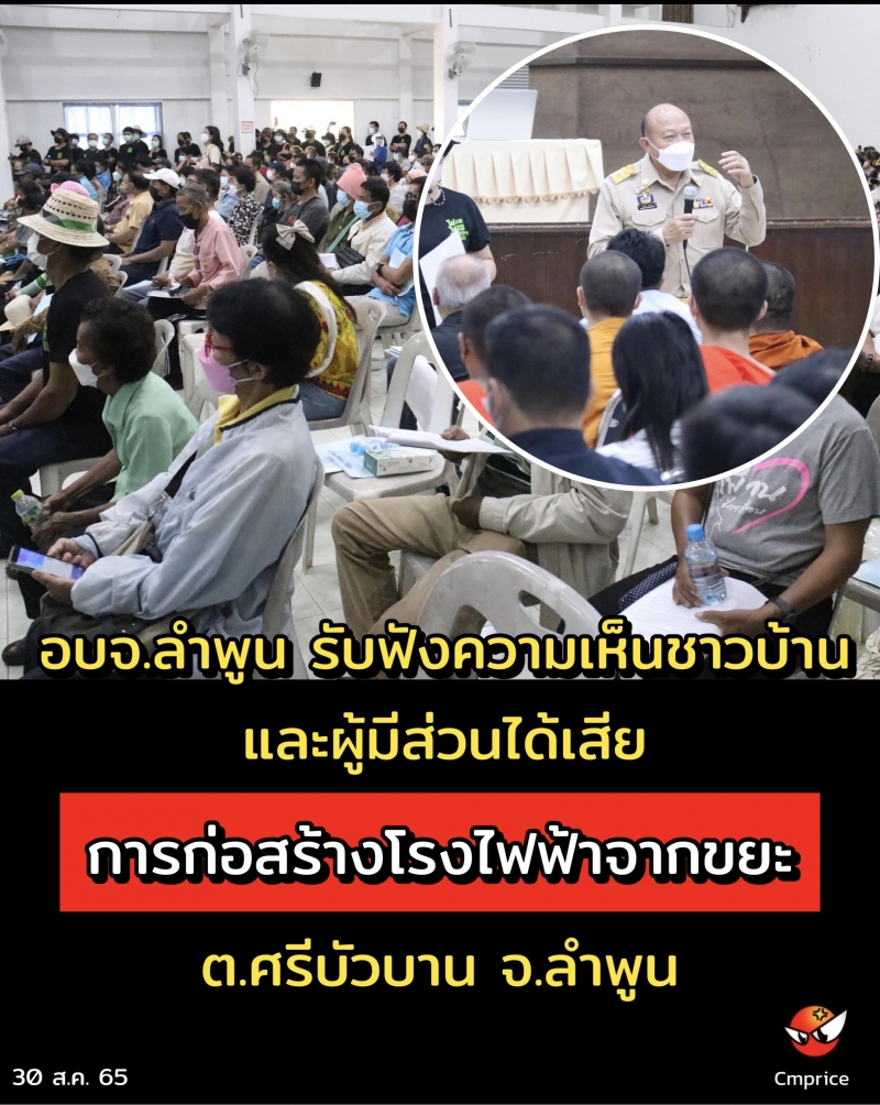วันที่ 29 สิงหาคม 2565 ที่อาคารหอประชุมองค์การบริหารส่วนจังหวัดลำพูน หมู่ที่ 15 ตำบลป่าสัก อำเภอเมืองลำพูนจังหวัดลำพูน นายอนุพงษ์ วาวงศ์มูล รองผู้ว่าราชการจังหวัดลำพูน เป็นประธานเปิดการประชุมรับฟังข้อคิดเห็นของประชาชนและผู้มีส่วนได้เสีย โครงการบริหารจัดการขยะมูลฝอยชุมชน เพื่อแปรสภาพเป็นพลังงานไฟฟ้าขององค์การบริหารส่วนจังหวัดลำพูน พร้อมด้วย นายอนุสรณ์ วงค์วรรณ นายกองค์การบริหารส่วนจังหวัดลำพูน นายสุนทรรุ่งโรจน์ ท้องถิ่นจังหวัดลำพูน อาจารย์จาก มาหาวิทยาลัยเชียงใหม่ ร่วมเปิดเวทีรับฟังข้อคิดเห็นและให้ข้อมูล ในการดำเนินการโครงการบริหารจัดการขยะมูลฝอยชุมชน เพื่อแปรสภาพเป็นพลังงานไฟฟ้า โดยมี ตัวแทนภาครัฐ ภาคเอกชน ภาคประชาชน ตัวแทนมหาวิทยาลัยเชียงใหม่และผู้มีส่วนได้เสียในโครงการดังกล่าวฯ ทั้งเปิดโอกาสแสดงความคิดเห็น ข้อเสนอแนะ ในการบริหารจัดการขยะแบบครบวงจรร่วมกัน