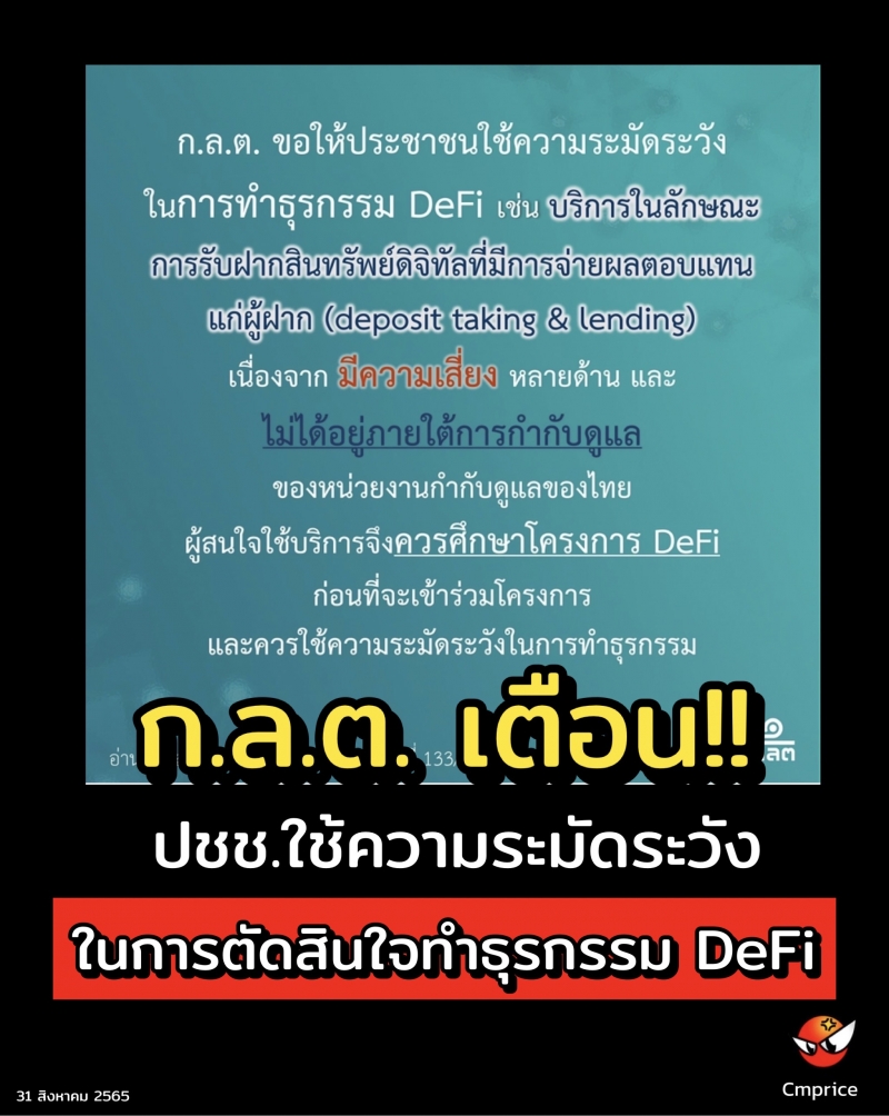 สำนักงานคณะกรรมการกำกับหลักทรัพย์และตลาดหลักทรัพย์ (ก.ล.ต.) ขอให้ประชาชนใช้ความระมัดระวังในการทำธุรกรรมเกี่ยวกับบริการทางการเงินแบบกระจายศูนย์ (Decentralized Finance: DeFi) เนื่องจากมีความเสี่ยงและไม่ได้อยู่ภายใต้การกำกับดูแลของหน่วยงานกำกับดูแลของไทย