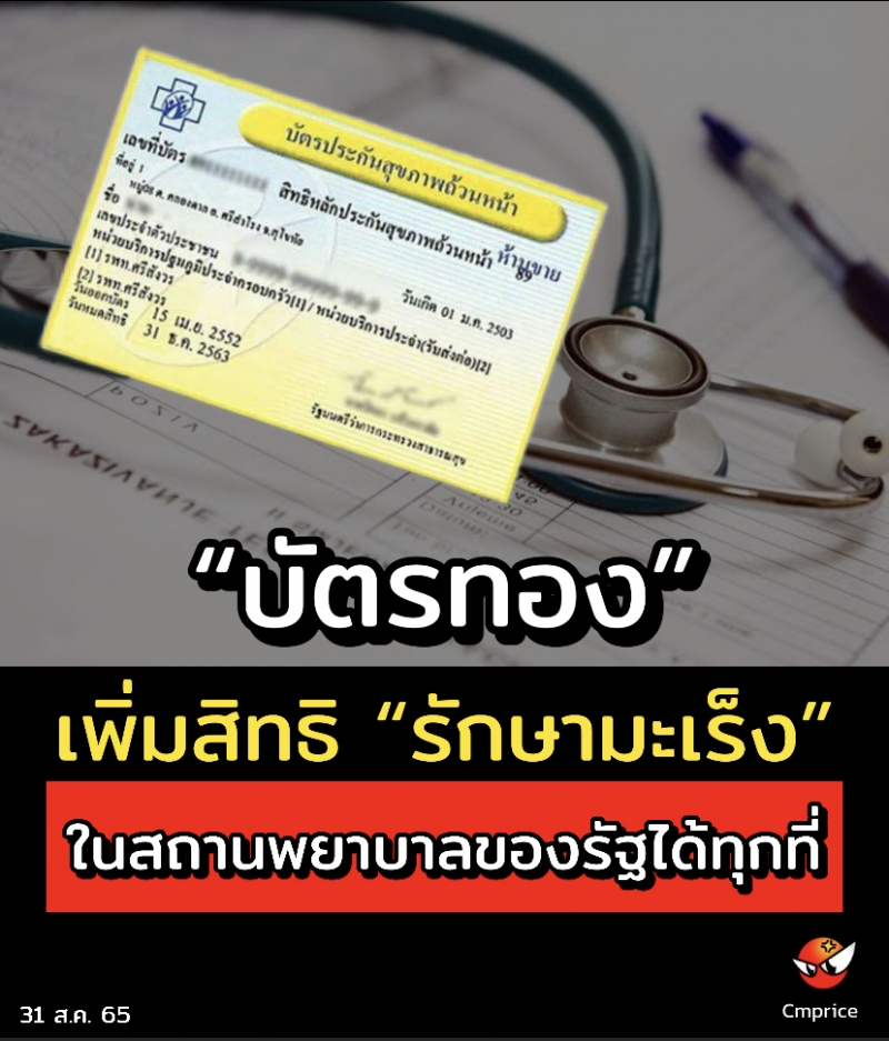 รัฐบาลโชว์ผลงาน ดูแลประชาชน บัตรทองรักษามะเร็งทุกที่ ครึ่งปีงบประมาณ 65 มีผู้ป่วยโรคมะเร็งเข้ารับบริการแล้ว 603,060 ครั้ง