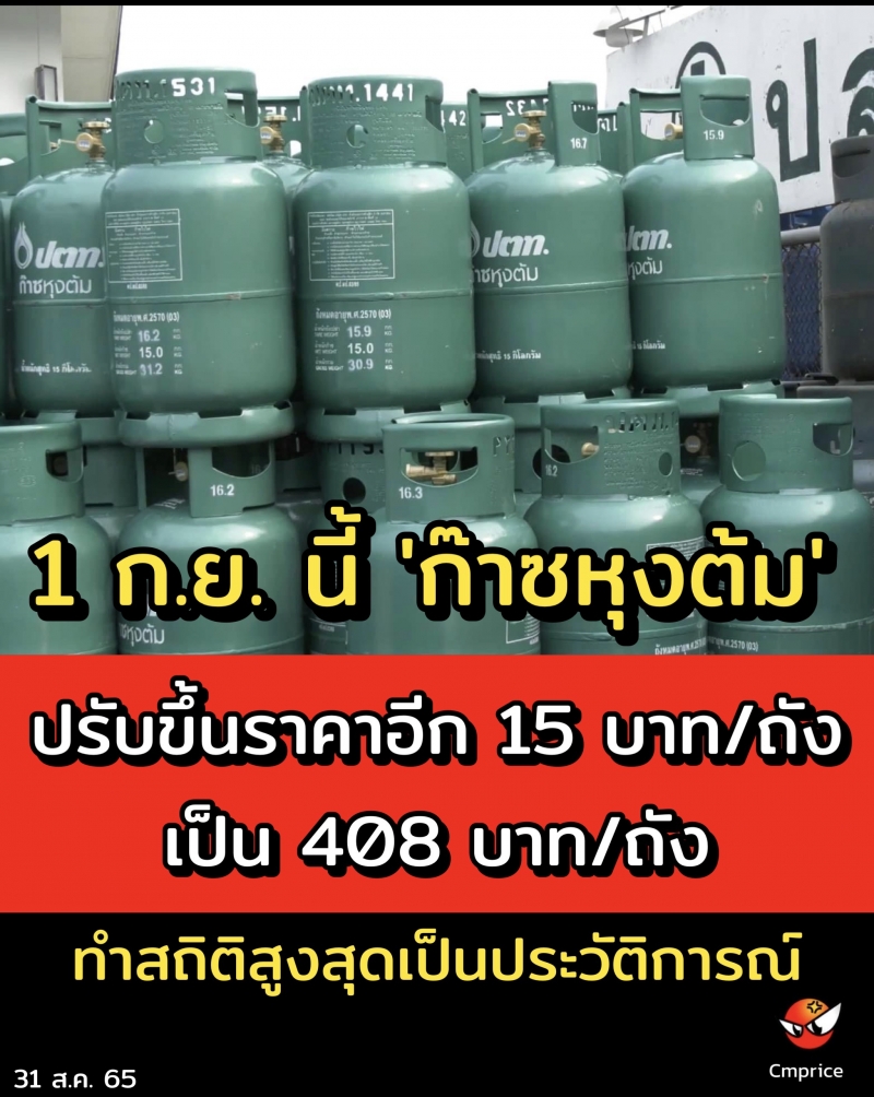 วันที่ 1 กันยายน 2565 ราคาก๊าซปิโตรเลียมเหลว (LPG) ภาคครัวเรือนในประเทศ จะปรับราคาขึ้นอีกกิโลกรัมละ 1 บาท ซึ่งจะทำให้ก๊าซหุงต้มขนาดถังละ 15 กิโลกรัมขยับราคาจาก 393 บาท/ถัง เป็น 408 บาท/ถัง ทำสถิติสูงสุดเป็นประวัติการณ์ ซึ่งเป็นไปตามมติคณะกรรมการบริหารนโยบายพลังงาน