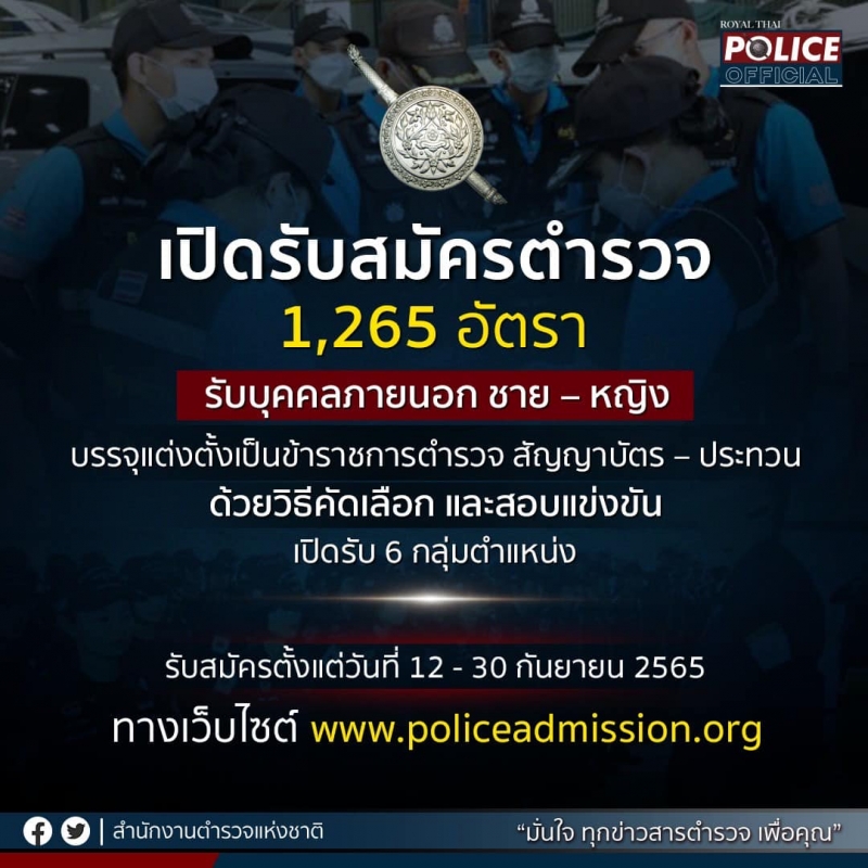 เมื่อวันที่ 2 กันยายน 2565 ที่สำนักงานตำรวจแห่งชาติ (ตร.) พล.ต.ต.ยิ่งยศ เทพจำนงค์ โฆษกสำนักงานตำรวจแห่งชาติ เปิดเผยว่า สำนักงานตำรวจแห่งชาติเปิดรับสมัครบุคคลภายนอกเพื่อบรรจุแต่งตั้งเข้ารับราชการเป็นข้าราชการตำรวจชั้นสัญญาบัตร และชั้นประทวน ประจำปีงบประมาณ พ.ศ.2565 จำนวน 1,265 อัตรา โดยเปิดรับสมัครตั้งแต่วันที่ 12 - 30 กันยายน 2565 โดยแจ้งรายละเอียด และเปิดรับสมัครทางเว็บไซต์ www.policeadmission.org