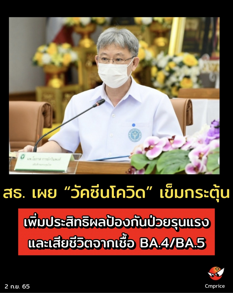 | • สธ. เผย วัคซีนโควิด เข็มกระตุ้น เพิ่มประสิทธิผลป้องกันป่วยรุนแรงและเสียชีวิตจากเชื้อ BA.4/BA.5 |