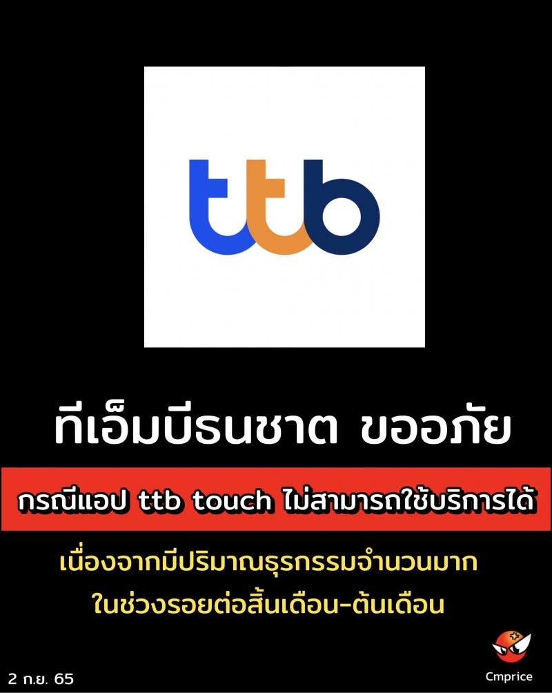 2 ก.ย. 2565 ทีเอ็มบีธนชาต ขออภัยกรณีแอป ttb touch ไม่สามารถใช้บริการได้