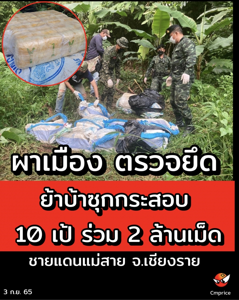 เมื่อเย็นวันที่ 2 ก.ย. 65 หน่วยเฉพาะกิจกรมทหารม้าที่ 3 กองกำลังผาเมือง จัดกำลังพล ร่วมกับ กองบังคับการควบคุมป้องกันและปราบปรามยาเสพติด ปฏิบัติภารกิจลาดตระเวนเฝ้าตรวจบริเวณพื้นที่ข้างสถานีควบคุมไฟป่าดอยตุง ตำบลห้วยไคร้ อำเภอแม่สาย จังหวัดเชียงราย  ได้ตรวจพบร่องรอยแผ้วถางหญ้ารกทึบ เข้าไปข้างในประมาณ 50 เมตร  จึงเข้าทำการตรวจสอบ พบเป้กระสอบดัดแปลงทรงสี่เหลี่ยม มีสายสะพาย จำนวน 10 เป้ ภายในบรรจุยาบ้า เป้ละ 200,000 เม็ด รวมจำนวน 2,000,000 เม็ด หน่วยจึงได้นำของกลางส่งให้กับเจ้าหน้าที่ตำรวจสภานีตำรวจภูธรแม่สาย เพื่อดำเนินการตามกฎหมายต่อไป