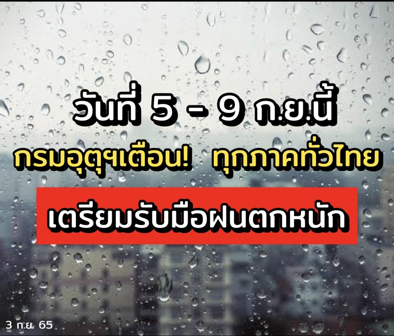 | • กรมอุตุฯเตือน! ทุกภาคทั่วไทย เตรียมรับมือฝนตกหนัก 5 - 9 ก.ย.นี้ |
