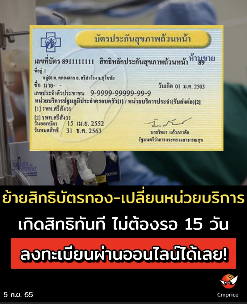 | • ย้ายสิทธิบัตรทอง-เปลี่ยนหน่วยบริการ เกิดสิทธิทันที ไม่ต้องรอ 15 วัน ลงทะเบียนผ่านออนไลน์ได้เลย! |
