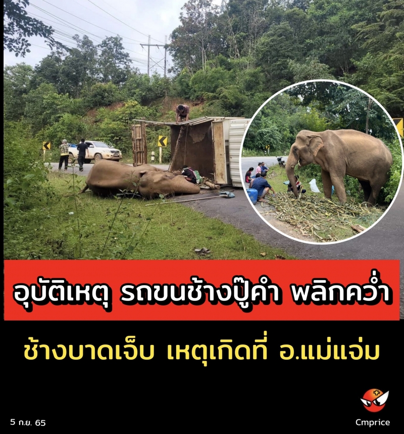อุบัติเหตุ รถขนช้างปู๊คำ พลิกคว่ำ ช้างบาดเจ็บ ที่ อ.แม่แจ่ม
