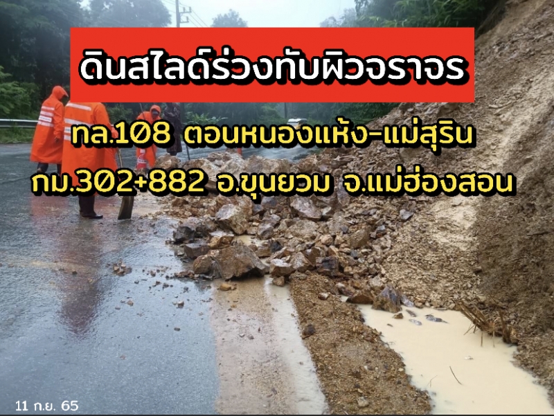 วันนี้ (11 ก.ย. 65) เวลา 08.00 น. แขวงทางหลวงแม่ฮ่องสอน โดย หมวดทางหลวงขุนยวม แจ้งภัยพิบัติเหตุฉุกเฉินดินสไลด์และหินร่วงทับผิวจราจร เนื่องจากมีฝนตกหนักตลอดทั้งคืน ทำให้ดินสไลด์ปิดทับผิวทางจราจร ต.ขุนยวมอ.ขุนยวม จ.แม่ฮ่องสอน ทางหลวงหมายเลข 108 ตอนหนองแห้ง-แม่สุริน กม.302+882 ด้านขวา การจราจรสามารถผ่านได้ 1 ช่องจราจร