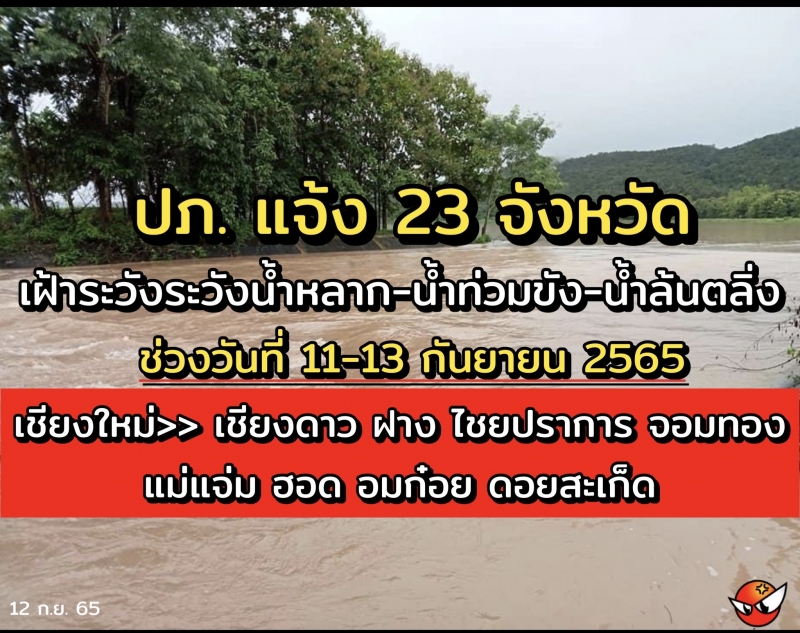 | • ปภ. แจ้ง 23 จังหวัด เฝ้าระวังระวังสถานการณ์น้ำหลาก น้ำท่วมขัง และน้ำล้นตลิ่ง ช่วงวันที่ 11-13 กันยายน 2565 |