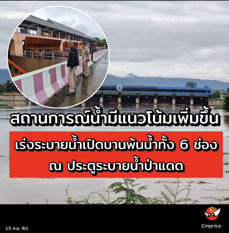 เมื่อวันจันทร์ที่ 12 กันยายน 2565 เวลา 12.00 น. นายจรินทร์ คงศรีเจริญ ผู้อำนวยการโครงการชลประทานเชียงใหม่ พร้อมนายเกื้อกูล มานะสัมพันธ์สกุล หัวหน้าฝ่ายวิศวกรรม โครงการชลประทานเชียงใหม่ ลงพื้นที่ติดตามสถานการณ์น้ำในแม่น้ำปิงที่ประตูระบายน้ำป่าแดด ตำบลป่าแดด อำเภอเมืองเชียงใหม่ จังหวัดเชียงใหม่ โดยปริมาณน้ำในลำน้ำปิงเมื่อเวลา 12.00 น. อยู่ที่ 262.50 ลูกบาศน์เมตร/วินาที ระดับน้ำอยู่ที่ 2.80 เมตร ต่ำกว่าระดับตลิ่งที่สถานีวัดน้ำสะพานนวรัฐ (P1) 90 เซนติเมตร และแนวโน้มปริมาณน้ำในลำน้ำปิงยังคงเพิ่มขึ้น โดยได้ดำเนินการบริหารจัดการเร่งการระบายน้ำโดยเปิดบานพ้นน้ำทั้ง 6 ช่องบานพร้อมสั่งการการระบายน้ำที่ประตูระบายน้ำแม่สอย อำเภอจอมทองเร่งการระบายน้ำโดยการยกบานพ้นน้ำทั้ง 10 บานเพื่อให้มวลน้ำไหลลงสู่เขื่อนภูมิพลได้อย่างรวดเร็ว