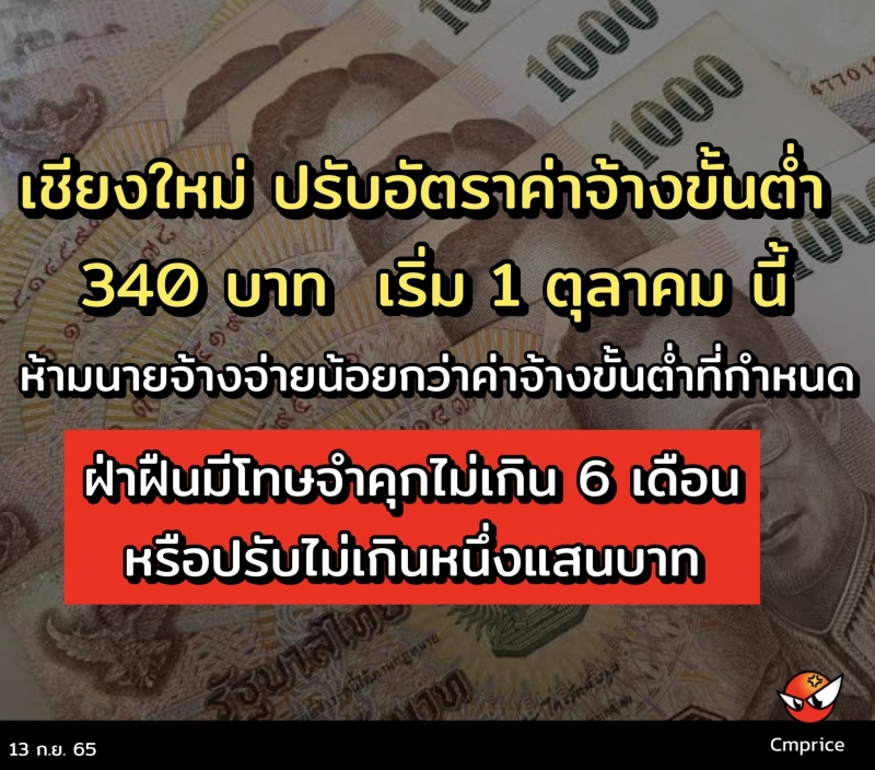 | • เชียงใหม่ ปรับอัตราค่าจ้างขั้นต่ำ 340 บาท เริ่ม 1 ตุลาคม นี้ ห้ามนายจ้างจ่ายน้อยกว่าค่าจ้างขั้นต่ำที่กำหนด ฝ่าฝืนมีโทษ |