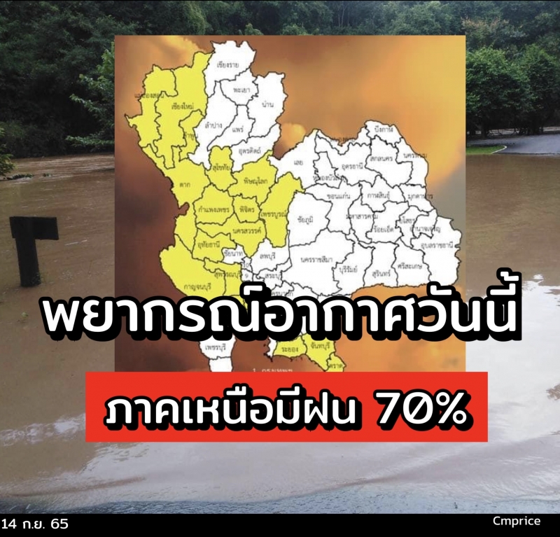 (14 ก.ย.2565) กรมอุตุนิยมวิทยา พยากรณ์อากาศ 24 ชั่วโมงข้างหน้า บริเวณความกดอากาศสูงปกคลุมประเทศลาวตอนบน และเวียดนามตอนบน ประกอบกับร่องมรสุมพาดผ่านภาคเหนือ และภาคตะวันออกเฉียงเหนือ ส่วนมรสุมตะวันตกเฉียงใต้พัดปกคลุมทะเลอันดามัน ภาคใต้ฝั่งตะวันตก และอ่าวไทย ลักษณะเช่นนี้ทำให้ประเทศไทยยังคงมีฝนตกต่อเนื่องและมีฝนตกหนักบางแห่งในภาคเหนือ ภาคกลาง รวมทั้งกรุงเทพมหานครและปริมณฑล ภาคตะวันออกและภาคใต้