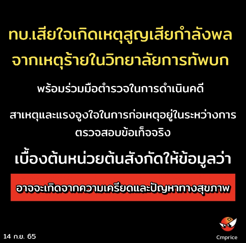 | • ทบ.เสียใจเกิดเหตุสูญเสียกำลังพล จากเหตุร้ายในวิทยาลัยการทัพบก พร้อมร่วมมือตำรวจในการดำเนินคดี |