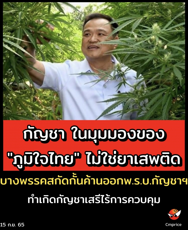 วันที่ 15 ก.ย.2565 เพจเฟซบุ๊กอนุทิน ชาญวีรกูล โพสต์กัญชาในมุมมองของพรรคภูมิใจไทย