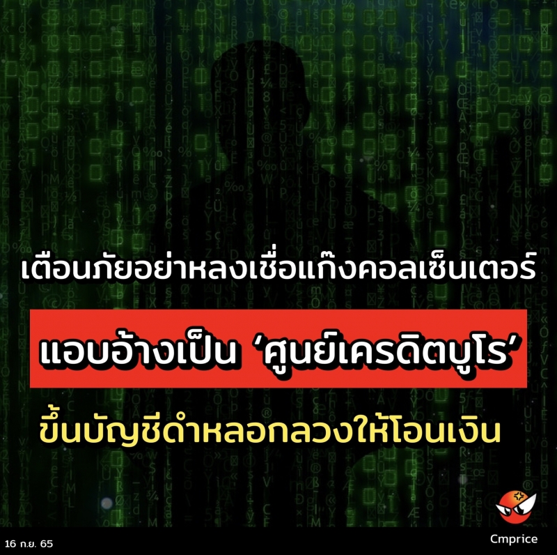 ล่าสุด พบแก๊งคอลเซ็นเตอร์ ทำการแอบอ้างชื่อเป็นศูนย์เครดิตบูโร หลอกลวงว่าหมายเลขบัตรประจำตัวประชาชนจะถูกขึ้นบัญชีดำ ขอให้ประชาชนอย่าหลงเชื่อ ไม่ให้ข้อมูลส่วนตัว รวมทั้งห้ามกดลิงก์หรือติดตั้งแอปฯ ตามที่คอลเซ็นเตอร์บอก