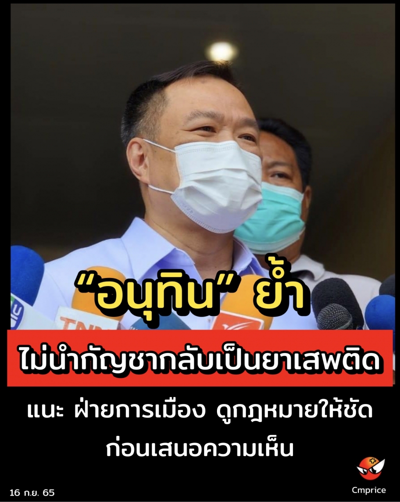 16 ก.ย. 2565 ที่ทำเนียบรัฐบาล กรุงเทพมหานคร นายอนุทิน ชาญวีรกูล รองนายกรัฐมนตรี รัฐมนตรีว่าการกระทรวงสาธารณสุข และหัวหน้าพรรคภูมิใจไทย กล่าวถึงกรณีที่สมาชิกพรรคประชาธิปัตย์ และเพื่อไทยบางคน เสนอให้นายอนุทิน แก้กฎหมาย ให้กัญชา กลับไปเป็นยาเสพติด ว่า คนที่เสนออย่างนั้นไม่ได้ศึกษากฎหมายในเรื่องของกัญชาอย่างละเอียด โดยหลังจากการที่กัญชาได้รับการปลดจากบัญชียาเสพติด ซึ่งมีผลตั้งแต่วันที่ 9 มิ.ย.