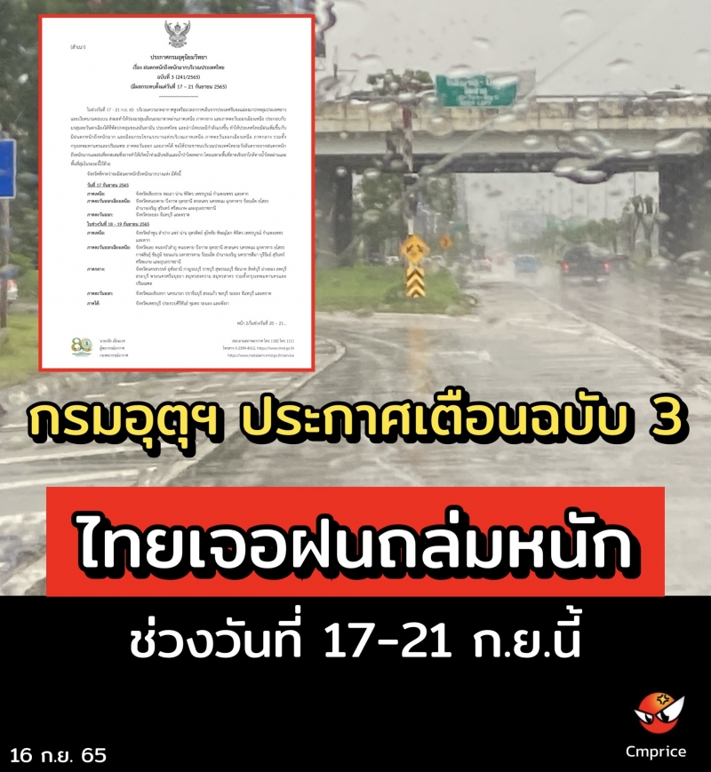 | • กรมอุตุฯ ประกาศเตือนฉบับ 3 ไทยเจอฝนถล่มหนัก ช่วงวันที่ 17-21 ก.ย.นี้ |