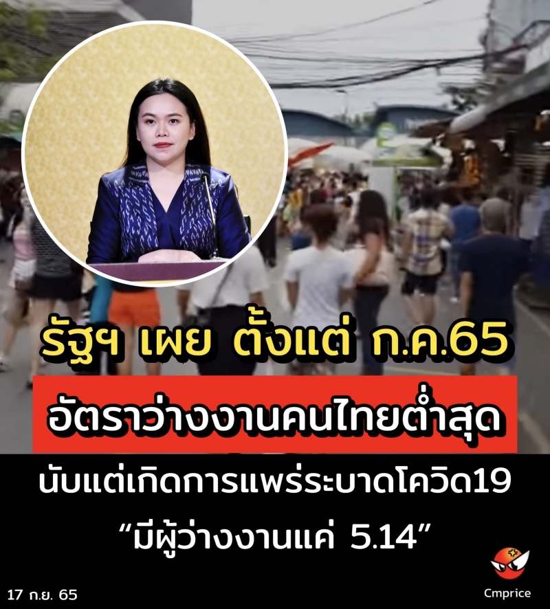 | • รัฐฯ เผย ตั้งแต่ก.ค. 65 อัตราว่างงานคนไทยต่ำสุดนับแต่เกิดการแพร่ระบาดโควิด19 มีผู้ว่างงานแค่ 5.14 |