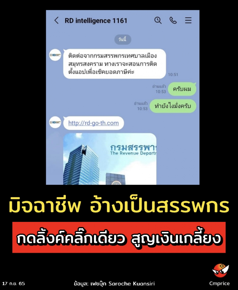 เฟซบุ๊ก Saroche Kuansiri โพสต์ข้อความ ไว้เป็นอุทาหรณ์โดนมิจฉาชีพอ้างตัวเป็นสรรพากร โดยระบุว่า  เมื่อ 2 วันที่ผ่านมา ราวๆ 11 นาฬิกา ผมได้รับโทรศัพท์สายหนึ่งเป็นเบอร์มือถือ พอรับเสร็จ มันถามว่า คุณ XX ใช่ไหมคะ โทรจากสรรพากรจังหวัดสมุทรสงคราม เรื่องตรวจสอบภาษีประจำปี ด้วยความที่หน่วยราชการเวลาโทรหาผมส่วนมากก็เบอร์มือถือ ผมก็ไม่ได้เอะใจตรงนั้น ผมก็คุยโต้ตอบกันว่าให้ผมไปที่จังหวัด หรือที่อำเภอ มันบอกไม่ต้องค่ะ เดี๋ยวนี้ใช้ระบบออนไลน์ ขออนุญาตแอดไลน์เบอร์โทรนี้เพื่อส่งลิงก์ พร้อมกับข้อความตามรูป เอาจริงๆ ผมไม่มีความรู้หรอกครับว่าลิงก์มันจะลงท้ายด้วยอะไร .com หรือ .co.th หรืออะไรก็แล้วแต่