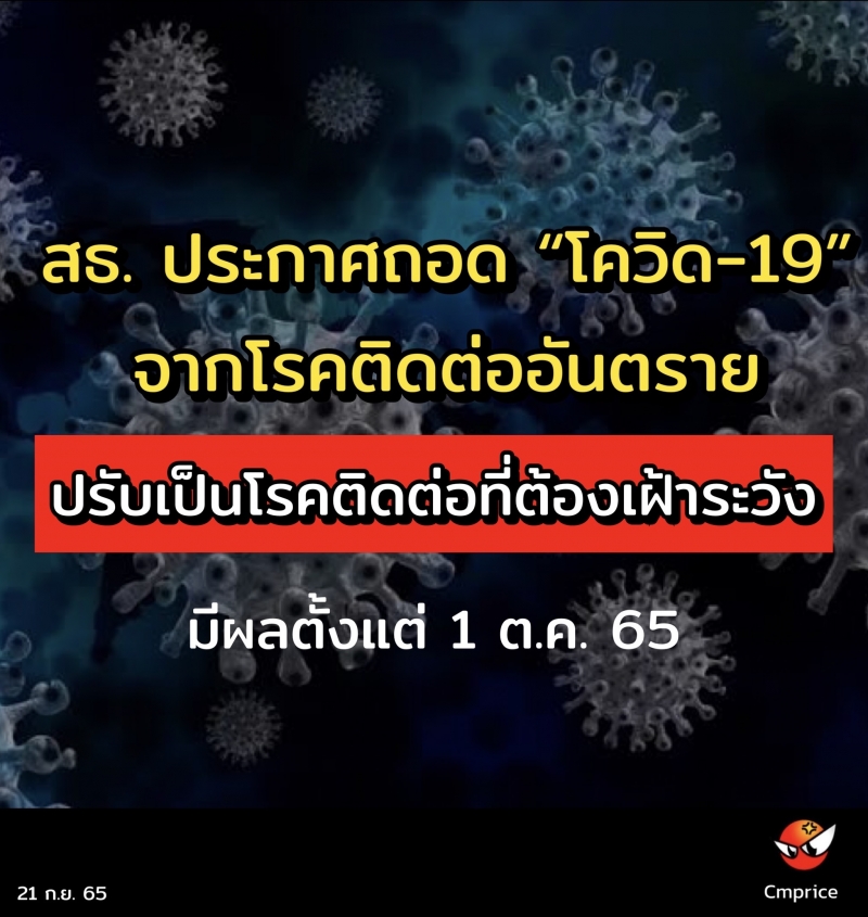 | • สธ. ประกาศถอด โควิด-19 จากโรคติดต่ออันตราย และปรับเป็นโรคติดต่อที่ต้องเฝ้าระวัง มีผลตั้งแต่ 1 ต.ค. 65 |