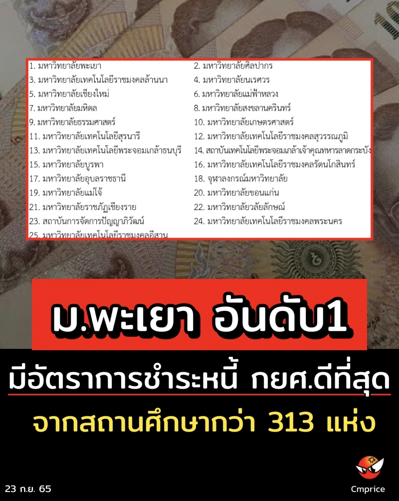 กองทุนเงินให้กู้ยืมเพื่อการศึกษา (กยศ.) เผยรายชื่อสถานศึกษาระดับอุดมศึกษาที่มีอัตราการชำระหนี้ดีที่สุด 25 อันดับแรกของประเทศ โดยมหาวิทยาลัยพะเยามีอัตราการชำระหนี้ดีที่สุดเป็นอันดับแรก