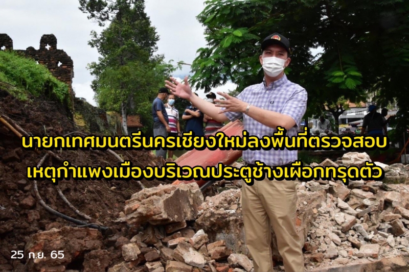 วันที่ 25 กันยายน 2565 นายอัศนี บูรณุปกรณ์ นายกเทศมนตรีนครเชียงใหม่ พร้อมด้วย นายสุนทรยามศิริ รองนายกเทศมนตรีนครเชียงใหม่ ลงพื้นที่ลงพื้นที่ตรวจสอบเหตุกำแพงเมืองบริเวณประตูช้างเผือกทรุดตัวหลังจากมีฝนตกหนักตลอดช่วงเช้ามืดของวันที่ 25 กันยายน โดยมี นายเมธิศ วุฒิฉายานันท์ เลขานุการนายกเทศมนตรี นายณภัทรประเสริฐดี ผู้อำนวยการสำนักช่าง นายยุวบูรณ์ ศักดิ์สม ผู้อำนวยการส่วนควบคุมอาคารและผังเมือง ร่วมลงพื้นที่ด้วย