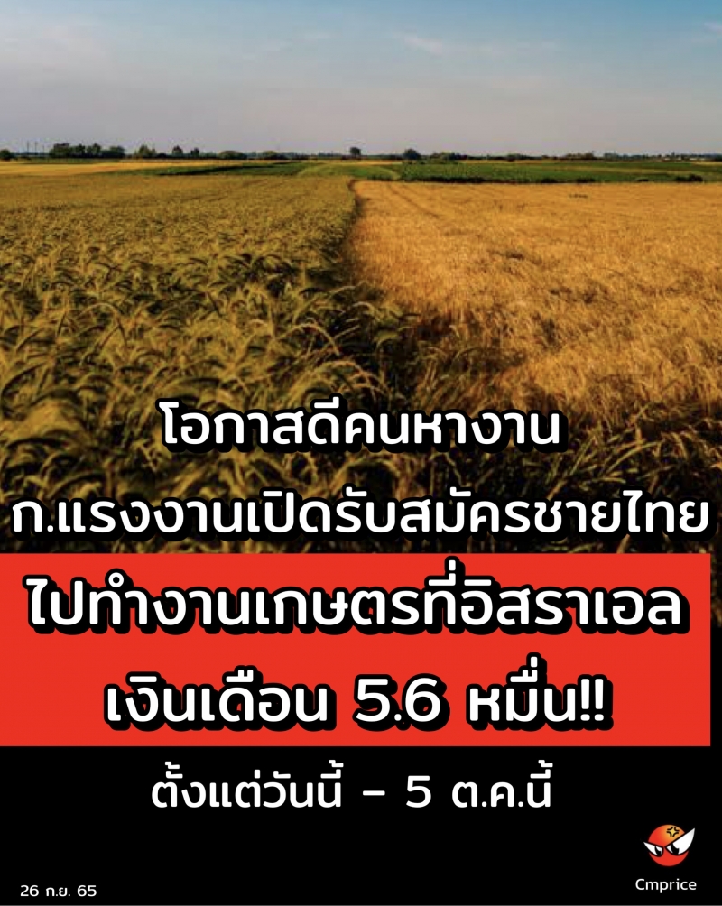 | • โอกาสดีคนหางาน ก.แรงงาน เปิดรับสมัครชายไทยไปทำงานภาคเกษตรที่อิสราเอล เงินเดือน 56,946 ตั้งแต่วันนี้ 5 ต.ค.นี้ |