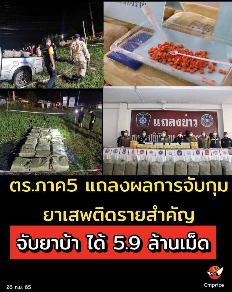 จึงได้ทำการติดตามไป พร้อมทั้งแจ้งให้ สภ.แม่ลาว จว.เชียงราย ทำการตั้งจุดตรวจเพื่อสกัดกั้น และเมื่อรถยนต์ผู้ต้องหาได้แล่นเข้ามาถึงบริเวณจุดตรวจ กลับได้เร่งความเร็วแล้วแล่นข้ามเกาะกลางถนนไปยังถนนฝั่งตรงข้ามและวิ่งสวนเลนถนนขับมุ่งหน้าไปทาง อ.แม่สรวยฯ ด้วยความเร็วสูง เจ้าหน้าที่จึงได้ไล่ติดตามไป เพื่อทำการสกัดรถยนต์ดังกล่าว ต่อมาพบว่า รถยนต์กระบะยี่ห้อ อีซูซุ ดีแม๊คแคป สีขาว หมายเลขทะเบียน ยธ 21xx เชียงใหม่ ได้เกิดอุบัติเหตุพลิกคว่ำบริเวณพื้นที่หน้าร้านเฮือนหมูกระทะ ม.1 ต.แม่พริก อ.แม่สรวยฯ ตรวจสอบท้ายกระบะพบ ยาเสพติดให้โทษประเภท 1 (ยาบ้า) จำนวน 31 กระสอบ ประมาณ 5,990,000 เม็ด จึงได้ตรวจยึดของกลางดังกล่าวไว้ ต่อมาเจ้าหน้าที่ตำรวจประจำด่านตรวจท่าก๊อ อ.แม่สรวยฯ สามารถควบคุมตัวผู้ต้องหา ที่ขับขี่รถยนต์กระบะยี่ห้ออีซูซุ ดีแม๊ค สีดำโหลดเตี้ย ไม่ติดแผ่นป้ายทะเบียน ซึ่งเป็นรถนำ ได้ที่บริเวณบนถนนสายท่าก๊อ - เวียงป่าเป้า ต.ท่าก๊อ อ.แม่สรวยฯ จึงได้ทำการจับกุมตัว ผู้ต้องหา พร้อมของกลางทั้งหมด ส่ง พงส. สภ.แม่สรวย จว.เชียงราย ดำเนินคดีตามกฎหมายต่อไป ในส่วนของสำนักงาน ปปส. ภาค 5 จะได้ทำการสืบสวนขยายผลเพื่อตรวจยึดอายัดทรัพย์สินที่เกี่ยวเนื่องกับการกระทำผิดยาเสพติดของบุคคลกลุ่มนี้ และผู้ที่เกี่ยวข้อง ต่อไป